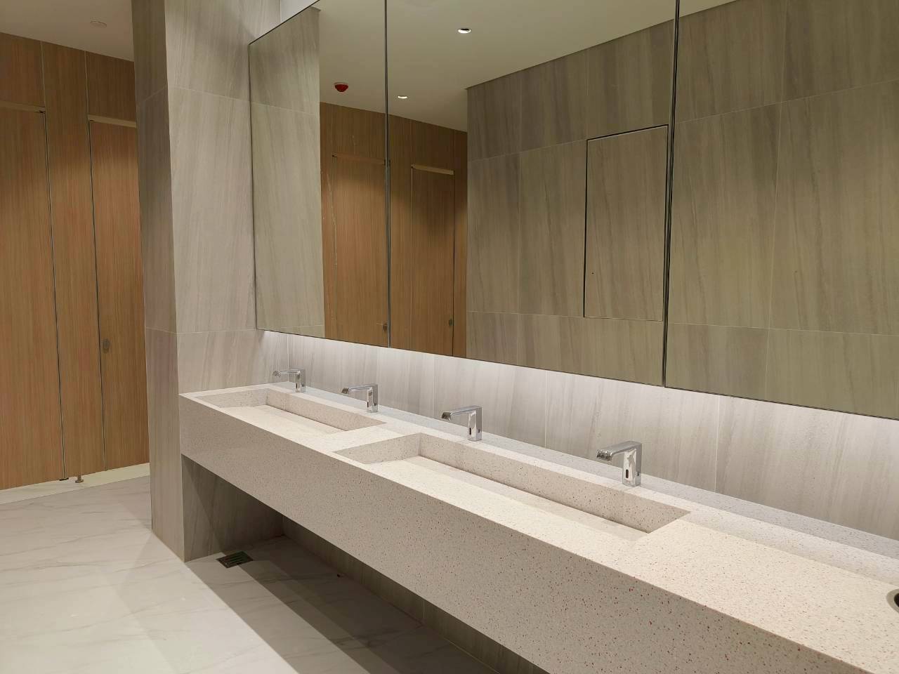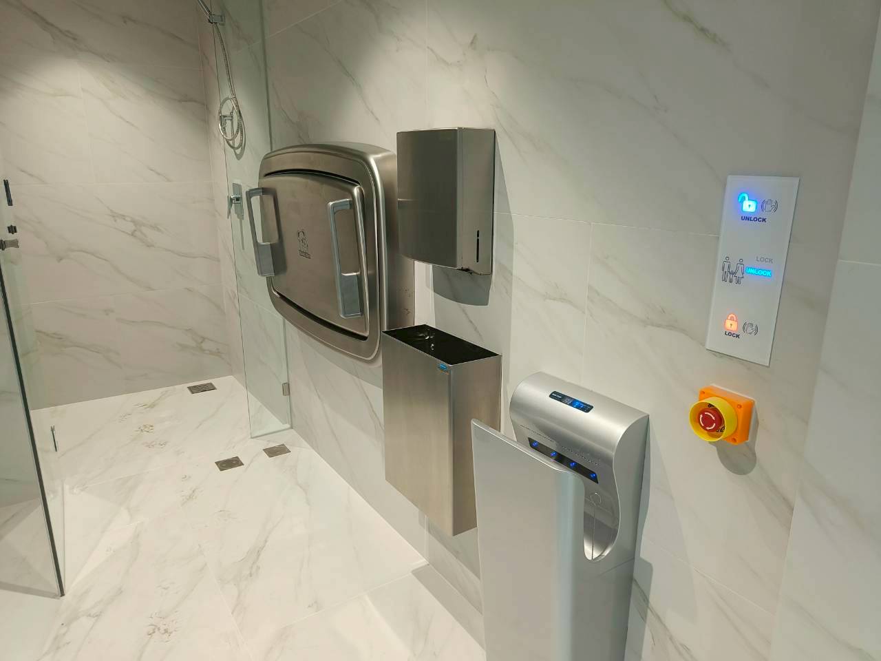 トイレは非常に清潔感があります。多目的トイレにはシャワーやおむつ交換台も完備されており、多様なニーズに対応した仕様は、最新オフィスならではの細やかな配慮を感じさせます。