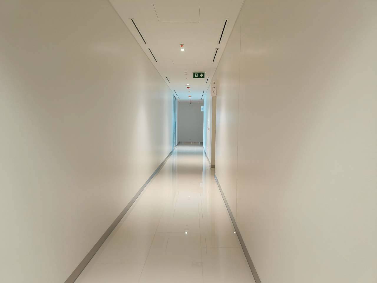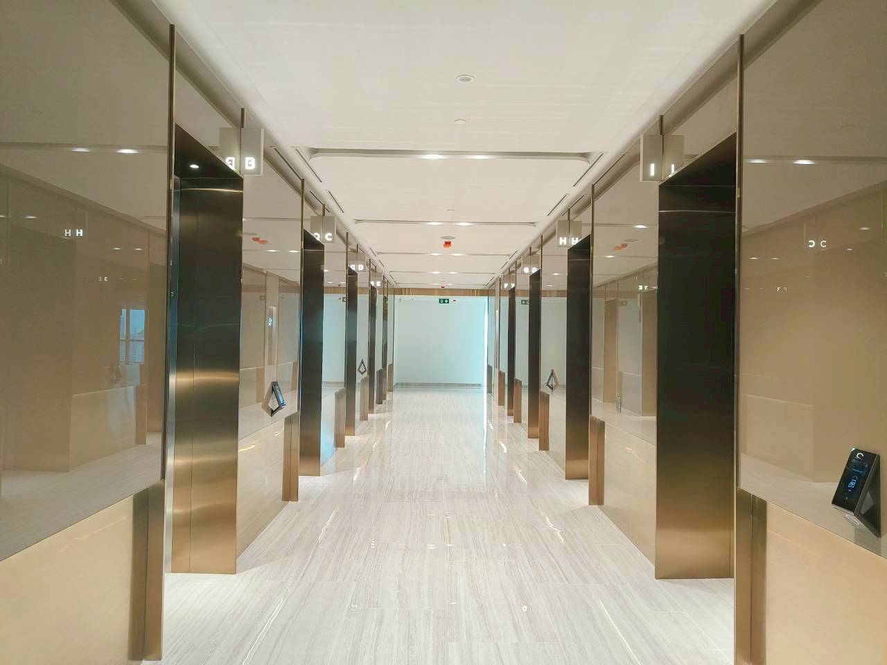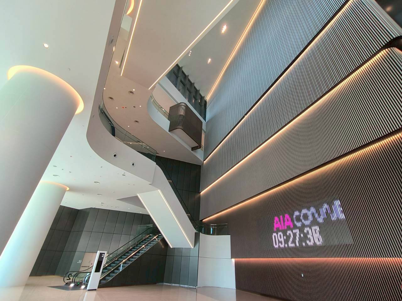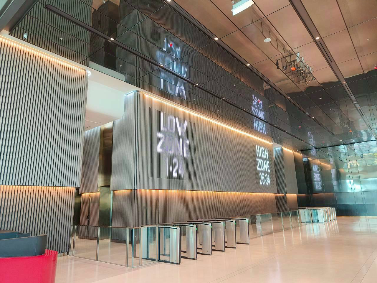 吹き抜け構造を採用した開放感あふれるロビーは、高層階まで続く曲線的なスロープとエスカレーターが視線を上へと誘う、ダイナミックな空間構成が印象的です。壁に設置されたサイネージが存在感を放ち、訪れる人に上質なビジネス環境であることを印象づけます。風水設計の思想を体現するかのような流れるような曲線が随所に取り入れられており、グレードAにふさわしい格調と躍動感を兼ね備えたエントランスです。