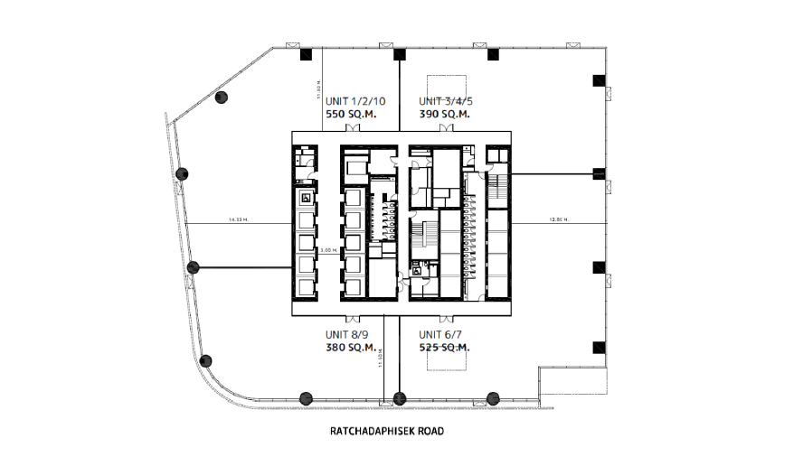 ラチャダーピセーク通り沿いに位置し、エスプラネード、セントラルラマ9、ビッグCエクストラといった大型商業施設が徒歩圏内に揃う、利便性の高いビジネスエリアです。ビル内に飲食店やカフェも豊富な商業ゾーン(G〜5階)を抱えており、ランチや商談後の一杯にも困りません。