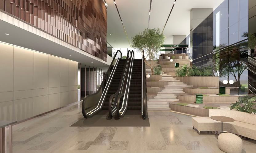 โถงต้อนรับถูกออกแบบให้มีบรรยากาศที่โปร่งโล่งด้วยเพดานสูง มีจุดเด่นอยู่ที่บันไดเลื่อนและบันไดหลักที่ตั้งอยู่ด้านหน้า พื้นที่ทั้งหมดได้รับการตกแต่งด้วยการใช้ต้นไม้และลายไม้ ซึ่งช่วยสร้างความรู้สึกที่อบอุ่นและหรูหราอย่างลงตัว นอกจากนี้ยังมีพื้นที่คาเฟ่จัดเตรียมไว้ เพื่อมอบความสะดวกสบายระหว่างการทำงานและการพักผ่อน