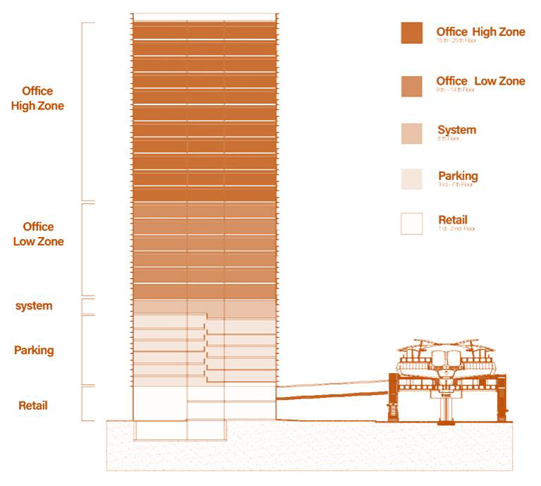 อาคารได้ติดตั้งลิฟต์ทั้งหมด 9 ตัว ซึ่งแบ่งการใช้งานออกเป็น: