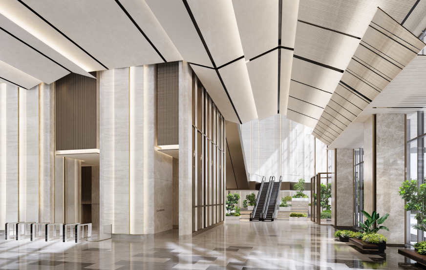 ล็อบบี้ของอาคารได้รับการออกแบบให้มีเพดานสูง และใช้แผงดีไซน์โมเดิร์นที่จัดวางในลักษณะพาดทแยง สร้างความรู้สึกที่โดดเด่นและทันสมัย