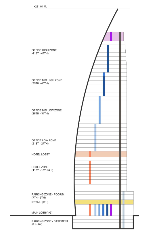 ลิฟต์ถูกแบ่งการใช้งานตามโซน ตั้งแต่ชั้นล่างถึงชั้นบน ทำให้ผู้ใช้งานสามารถขึ้นไปยังปลายทางได้โดยไม่ต้องหยุดรับ-ส่งผู้โดยสารในโซนอื่นๆ ช่วยลดระยะเวลารอคิวและเพิ่มประสิทธิภาพในการสัญจรภายในอาคาร