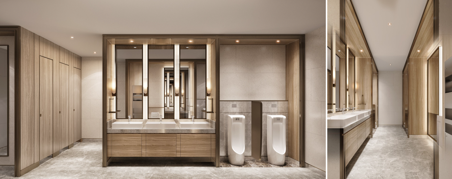 ผนังและพื้นใช้วัสดุลายหิน ทำให้บรรยากาศคล้ายกับโรงแรมระดับ นอกจากนี้บริเวณอ่างล้างหน้ายังติดตั้งกระจกบานใหญ่ และ ไฟซ่อน (hidden lighting) ซึ่งช่วยเพิ่มความรู้สึกโปร่งสบายและกว้างขวาง