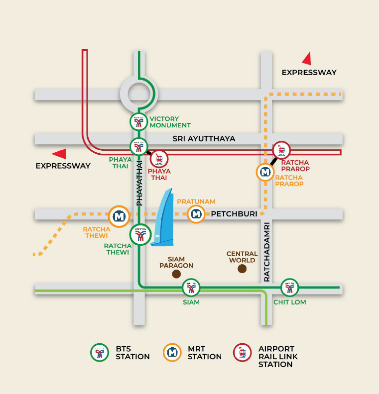 อาคารมอบการเชื่อมต่อที่สะดวกสบาย ด้วยทางเชื่อมตรงเข้าสู่สถานี BTS ราชเทวี ซึ่งในอนาคตจะกลายเป็นสถานี interchange ของ MRT สายสีส้ม สถานีราชเทวี