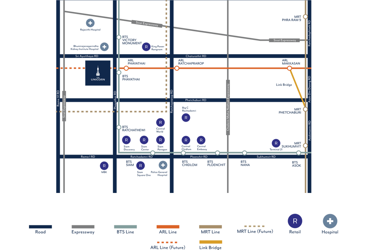 BTSスクンビット線とエアポートレールリンク(ARL)が交差するパヤタイエリアに位置し、交通の利便性は抜群です。